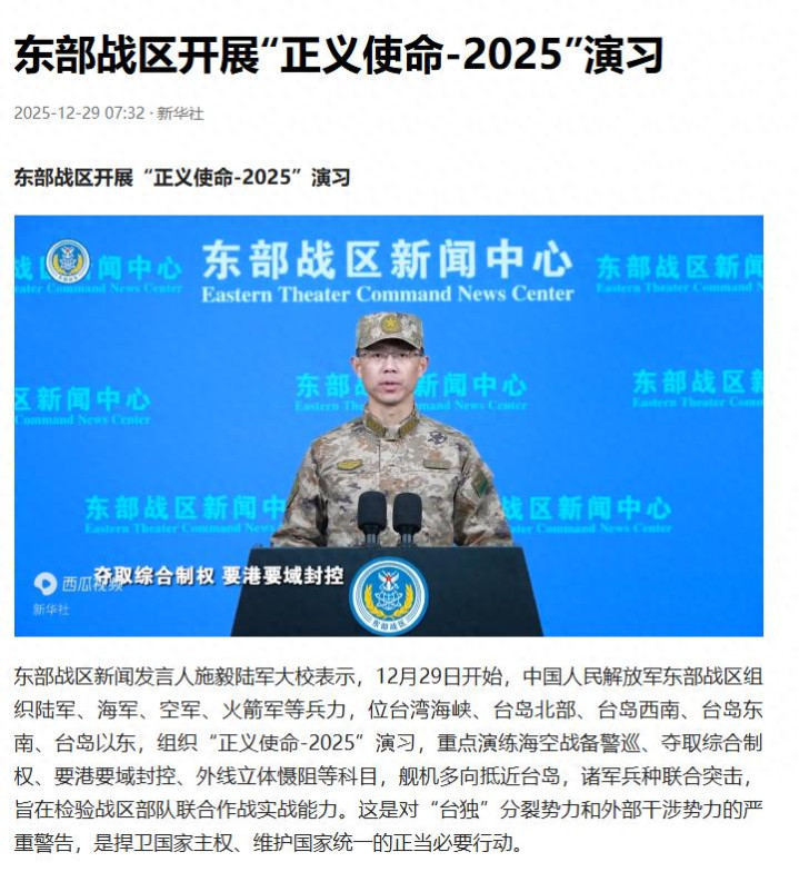 咱们的东部战区新闻发言人施毅陆军大校也说了,此次围台军演“正义使命-2025”将会重点演练海空战备警巡、夺取综合制权、要港要域封控、外线立体慑阻等科目,舰机多向抵近台岛,诸军兵种联合突击,旨在检验战区部队联合作战实战能力。