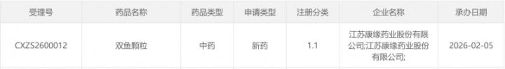 回顾康缘药业双鱼颗粒的研发历程,可谓稳扎稳打。2023年11月,康缘药业公示了双鱼颗粒的III期临床试验,这一阶段对于验证药物的有效性和安全性至关重要。经过严谨的试验设计与执行,2024年6月,该临床试验顺利完成,为后续申报上市奠定了坚实基础。2026年2月,申报NDA获受理(受理号CXZS2600012),上市曙光初现。