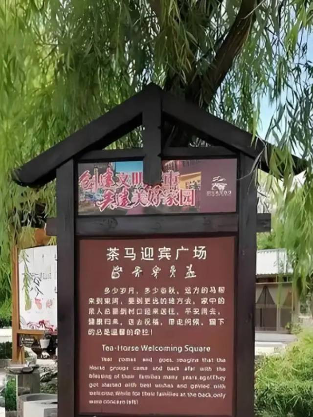 穿过古镇大门,就是茶马迎宾广场。这一新建广场继承弘扬了古镇悠久的茶马历史文化